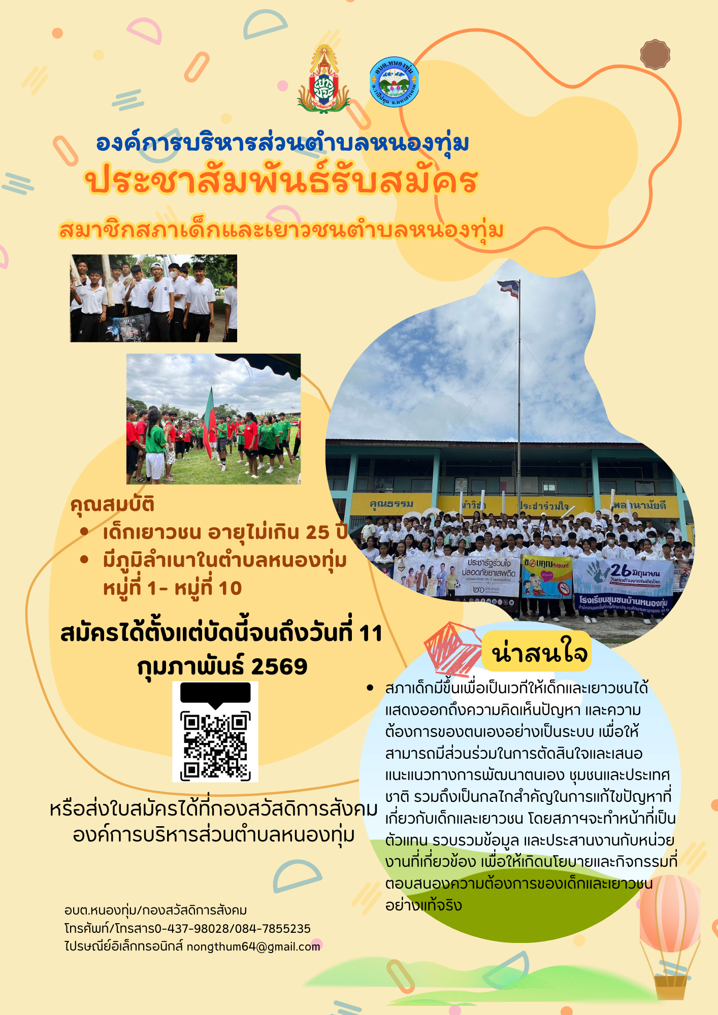 ประชาสัมพันธ์รับสมัครสมาชิกเด็กและเยาวชนตำบลหนองทุ่ม ประจำปีงบประมาณ 2569